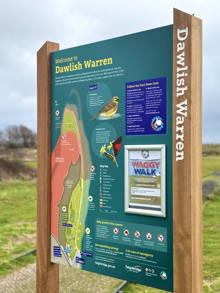 On arrival at Dawlish Warren, drive through the access tunnel (Max height 2.54m) and park in the seaward car park. This car park is pay and display. We’ll be meeting on the grassed area directly in front of the car park. Look out for the Devon Loves Dogs van and pavement sign.